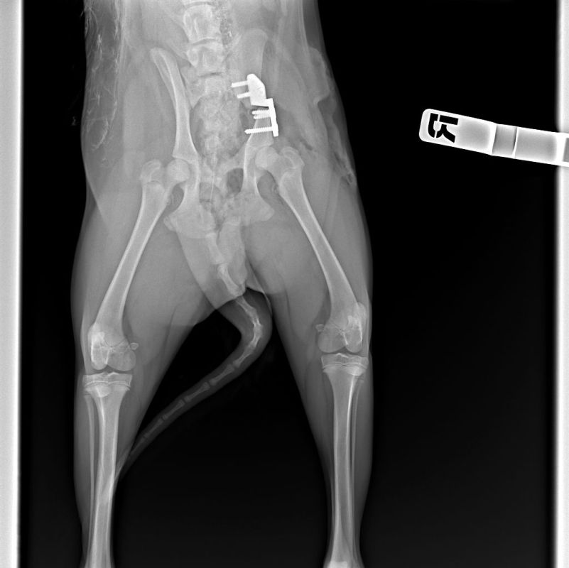 - Лечение переломов. Животные – активные пациенты, которым невозможно объяснить потребность в ограничении подвижности. Поэтому гипсование конечности в большинстве случаев не приносит желаемого результата. Мы выполняем остеосинтез с использованием пластин LCP – они надежно фиксируют отломки кости и соединяются друг с другом винтами, что гарантирует благополучное сращение в 95% случаев. Также мы применяем остеосинтез с внешними фиксаторами – аппаратом Илизарова и другими.